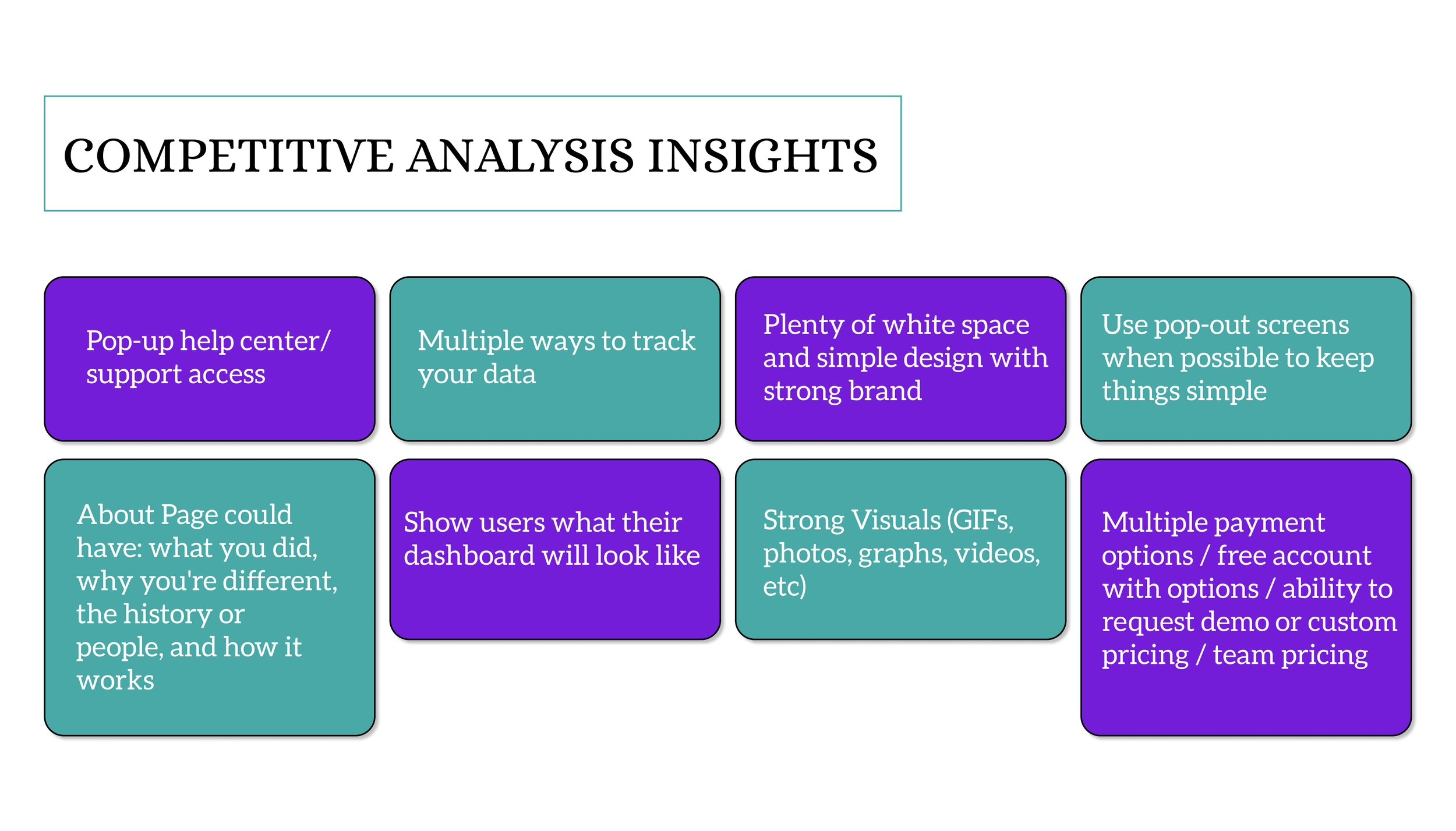 We ran usability testing on 4 different link-shortening sites to see what they offered, and what they didn’t seem to be doing well. This would in turn help me pull insights that would lead to the creation of our MVP and improve on things that they weren’t doing well.