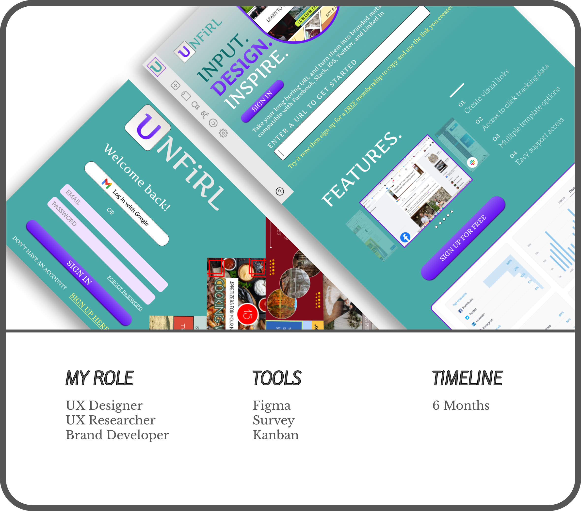 Unfirl set out to change the way we use Meta Tags. We wanted to create a visual component with links that created unshakable branding and allowed users to market themselves and their products through link sharing alone with easy access to a dashboard so they could keep track of each link’s activity online.